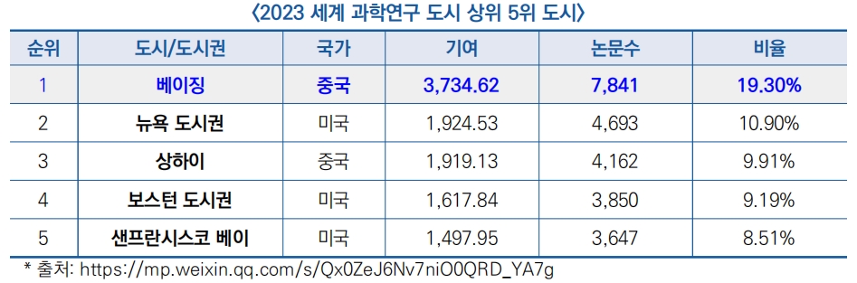 - 세계 과학연구도시(도시권) 상위 10위권에 베이징(1위), 상하이(3위), 난징(6위), 광저우(8위), 우한(10위) 등이 진입