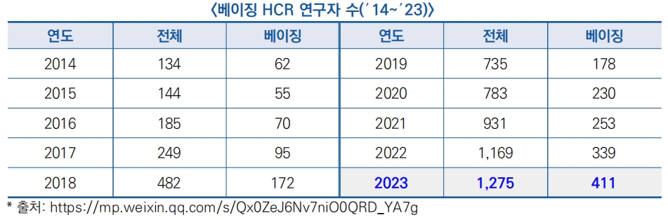 ![]() ○ 지난 11월 미국 학술정보서비스 분석기업 클래리베이트(Clarivate)사가 발표한 ‘2023년 세계가장 영향력 있는 연구자(HCR)’ 명단 중 베이징이 세계 1위(411명)로 부상
