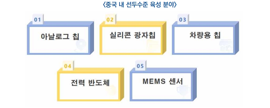 - 아날로그칩, 실리콘 광자칩 등 5대 분야를 중국 내 선두수준으로 육성하고 영향력이 있는 집적회로 설계산업 클러스터로 부상