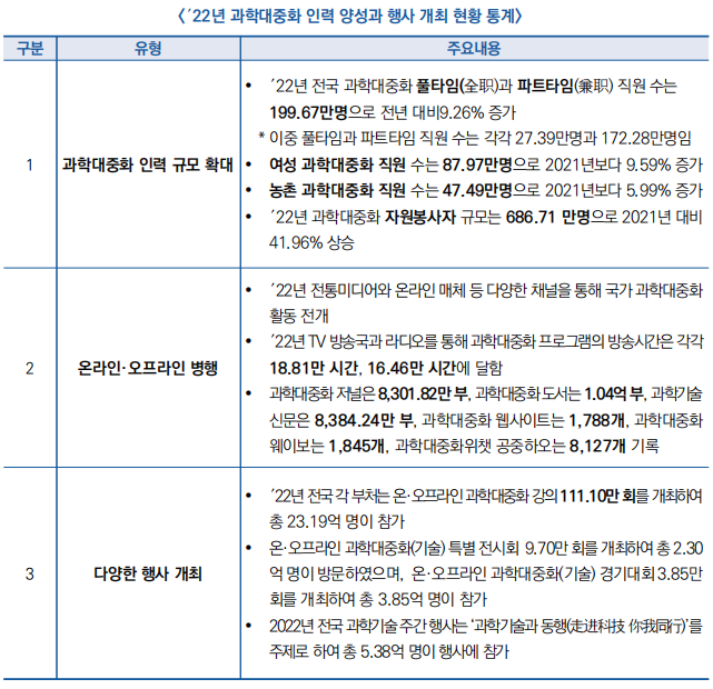 - 이 외에 청소년 과학기술관 수는 569개, 과학대중화 전용차량은 1,118대, 이동형 과학기술관 수는 1,330개, 과학대중화 전문 칼럼은 25.96만 개에 달함