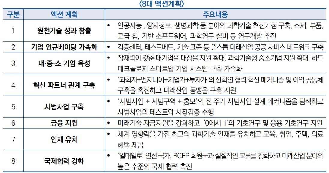 ![]() ![]() ○ 원천기술 성과 창출, 기업 인큐베이팅 가속화 등 8대 액션계획을 실시하여 미래산업 혁신발전 생태계 구축