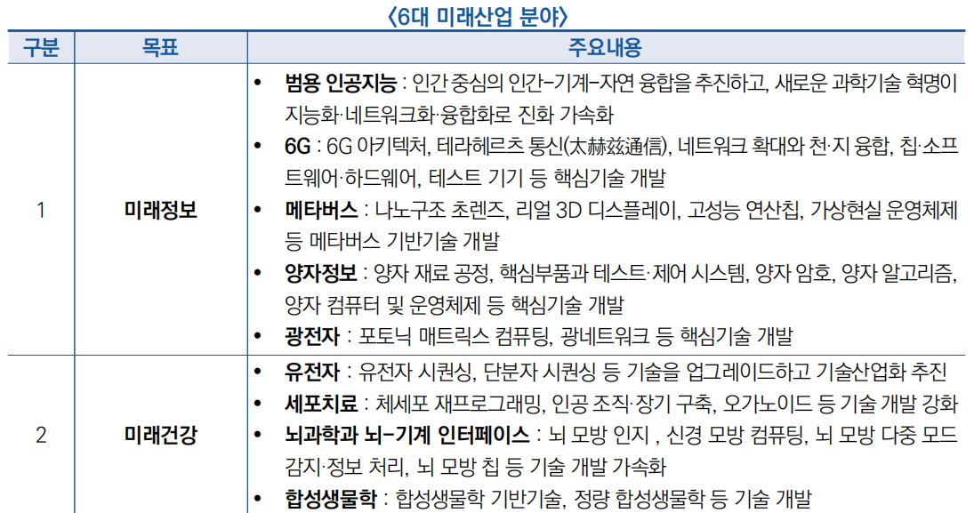 ![]() ○ 주요 내용으로 미래정보, 미래건강, 미래제조 등 6대 미래산업 혁신거점 구축 제시