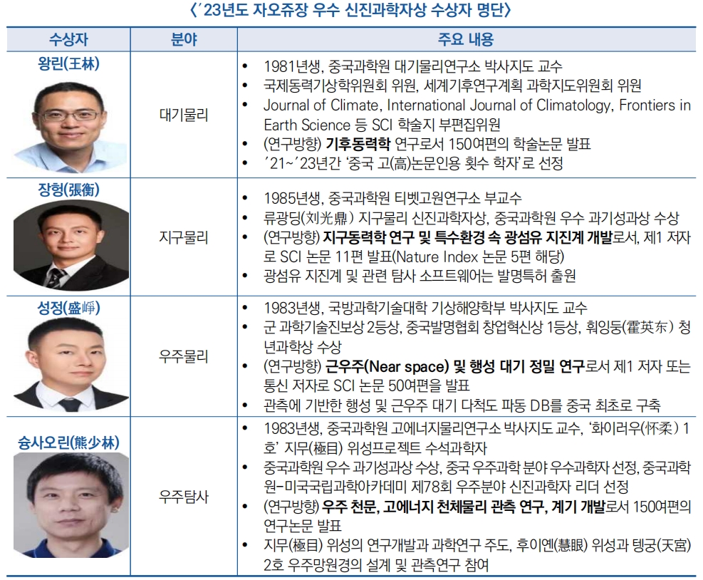 | ′23년도 우주 분야 자오쥬장(趙九章) 우수 신진과학자상 명단 공개 | ||