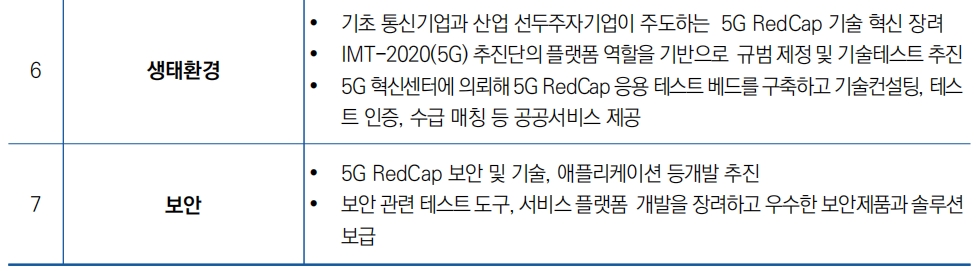 - (기술산업) 5G RedCap 표준을 발전시켜 다양한 응용수요 충족, 칩, 모듈 및 단말 등 핵심 산업망의 원가를 낮추고 100여 종의 단말제품 형성