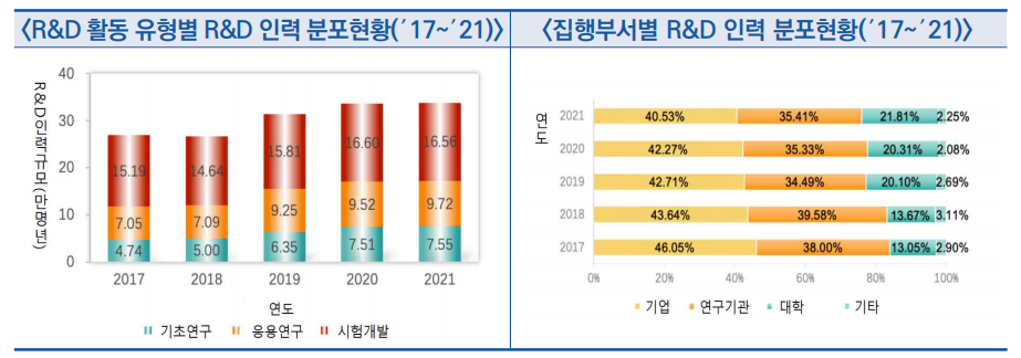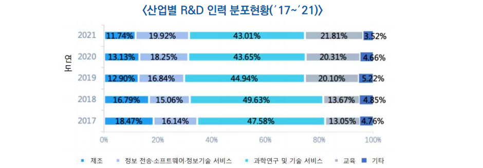 - 제조, 교육, 정보 전송·소프트웨어·정보기술 서비스 분야의 R&D 인력 수는 3.97만 명, 7.38만 명, 6.74만 명으로 전체 R&D 인력의 각각 11.74%, 21.81%, 19.92% 차지