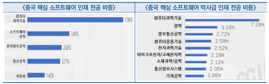 ![]() - 전공 분야는 주로 컴퓨터과학기술, 소프트웨어공학, 전자정보공학, 통신공학, 자동화 등에 집중되었고, 최근 광학, 기계공학 등 분야 박사급 인력이 산업소프트웨어 분야로 전향
