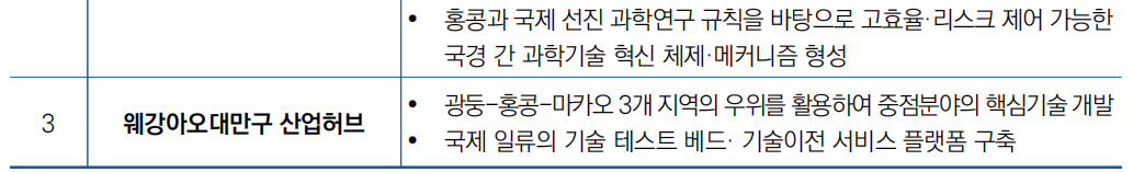 - ′35년까지 홍콩단지와의 협동 혁신 구도를 기반으로 과학기술 혁신 글로벌 수준을 세계적 선두로 제고