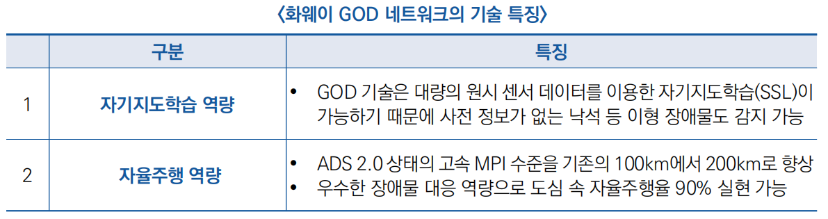 - 카메라, 밀리파 레이더, 레이저 레이더 등의 신호를 융합하여 자기지도학습(SSL)이 가능하여 행인, 차량 등 상규적인 물체 외에도 사전 정보가 없는 이형 장애물도 주도적으로 감지 가능