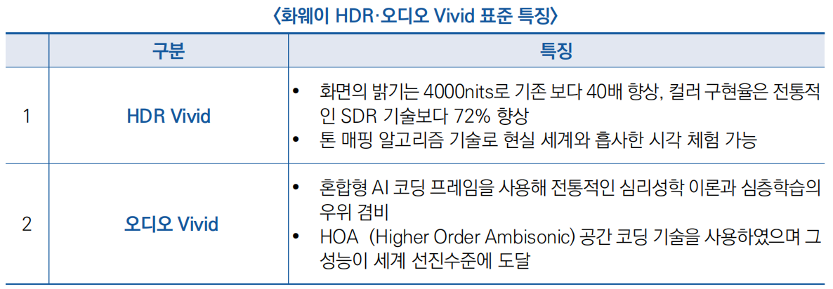 - 화웨이 HDR Vivid는 다이나믹 메타데이터, 톤 매핑(Tone Mapping) 등 신기술을 사용한 영상기술로 풍부한 컬러의 몰입형 시각 체험 구현