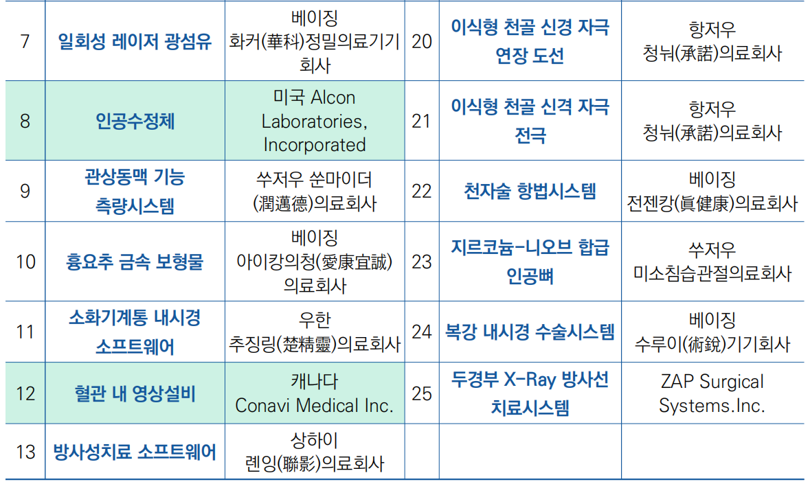 - 총 25개 승인된 의료기기 중 미국, 한국, 캐나다 등 해외 의료기기업은 인슐린 주입시스템, 콜라겐 연골 재생 스텐트, 인공수정체, 혈관내 영상설비 등 기기를 출시