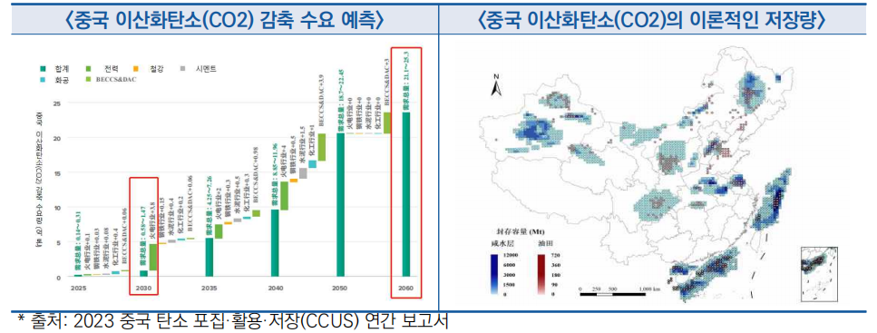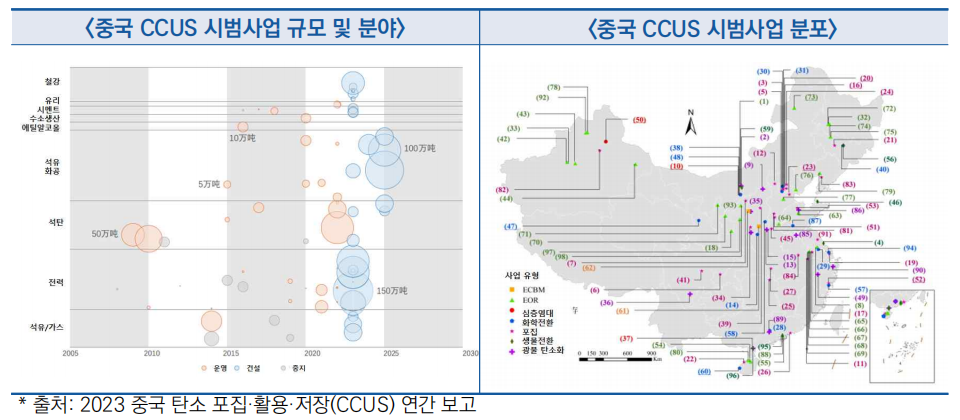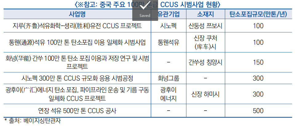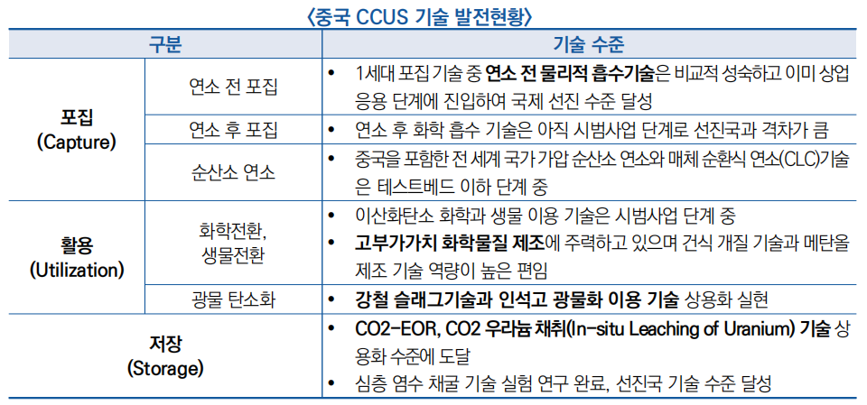 - 중국은 이미 탄소 포집·활용·저장 등 기술 기반을 구축했으나 대규모 상용화 능력 부족