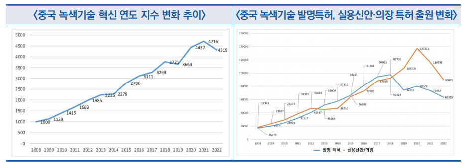 ○ 링이즈크사가 발표한 ‘중국녹색기술혁신지수보고’에 따르면 ′22년 한해 중국 전체 녹색기술 특허 출원량은 153,400건, 등록량은 157,323건을 기록