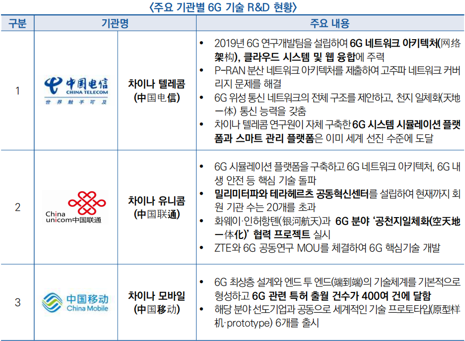 □ 차이나 모바일(中國移動), 차이나 텔레콤(中國電信) 등 주요업체의 6G 연구개발 현황(6.20)