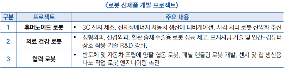 - 의료 서비스업, 제조업, 건축업, 농업 등 중점분야에 있어 수백 개의 로봇 혁신 응용기술· 솔루션 개발 및 로봇기술 시범사업 추진