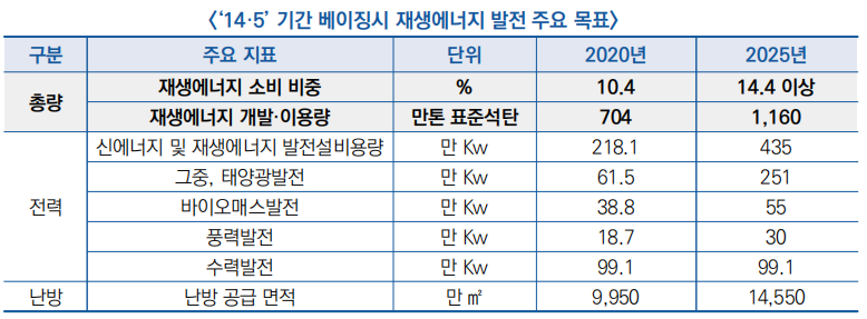 - (주요목표) 베이징시는 재생에너지 소비 비중을 2025년의 14.4%(최고 목표치 15%)를 거쳐 2030년까지 25%로 끌어올릴 계획