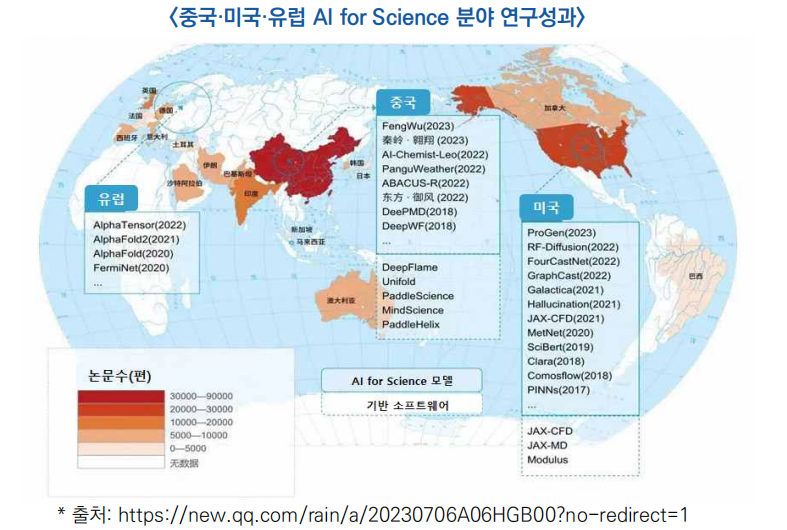 ![]() - 중국의 AI for Science 분야 논문 수는 세계 1위를 차지하고 중국·미국·유럽 3개 국가(지역)의 논문 수는 글로벌 전체의 80%를 차지