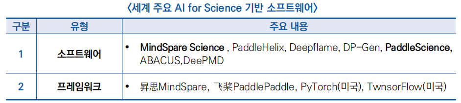 - 중국 세계적 연구성과로 PaddleScience, MindSpore Science, MEGA-Protein, 붕정·신농(鹏程·神农), 동방·웨봉(东方·御风) 및 Pangu-Weather(盘古天气) 등 기반 소프트웨어·모델을 들 수 있음