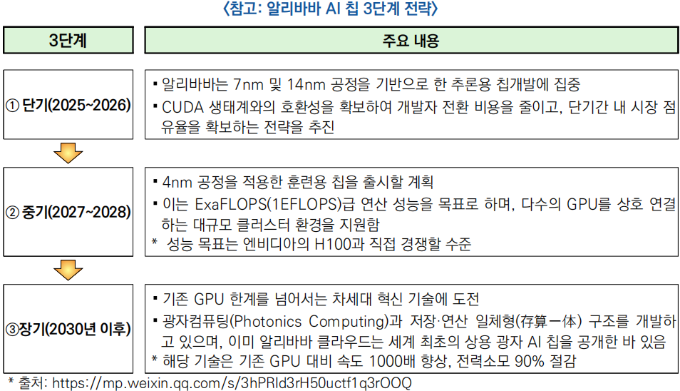 ○ 이러한 상황 속에서 알리바바는 TSMC 의존을 줄이고 국산 파운드리 기반의 칩 생산 체제를 가동하면서 ①단기 호환 → ②중기 대체 → ③장기 초월이라는 AI 칩 단계별 로드맵을 수립