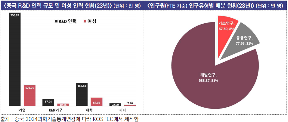 ![]() □ 중국 과학기술통계연감 2024에 따르면, 2023년 기준으로 중국의 R&D 인력은 1,022.54만 명(여성 265.30만 명)으로 세계 최대 규모이며, 연구원(FTE 기준*)은 724.06만 명으로 집계되었음