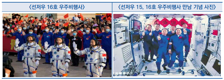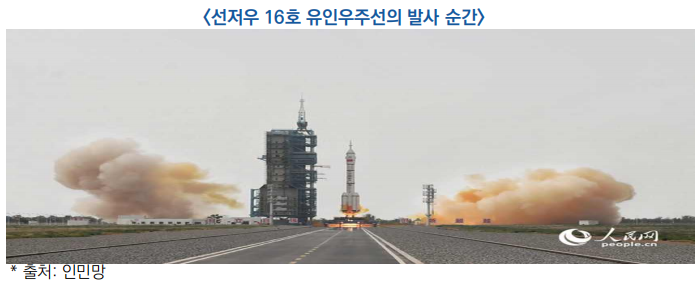 ○ 선저우(神舟) 16호는 지난해 말 완공한 중국 우주정거장 ‘텐궁(天宮)’의 응용 및 개발 단계에서 처음으로 발사한 유인우주선으로, 임무 기간은 11월까지임