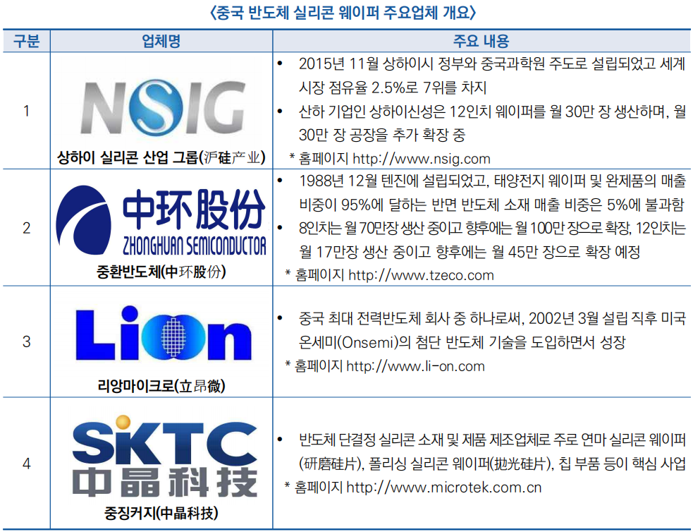 * 시장점유율을 보면 상하이 실리콘 산업 그룹 11.8%, 중환반도체 10.2%, 리앙마이크로 8.2%, 중징커지 2.1% 차지