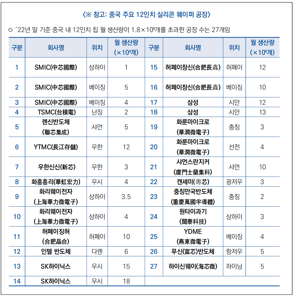 - ′22년 기준 중국의 8인치 실리콘 웨이퍼 생산량은 전 세계의 21%, ′25년에는 66%에 달할 것이고, 월 생산량은 1.8×10⁶개를 달성할 전망(국제반도체산업협회(SEMI) 통계자료)