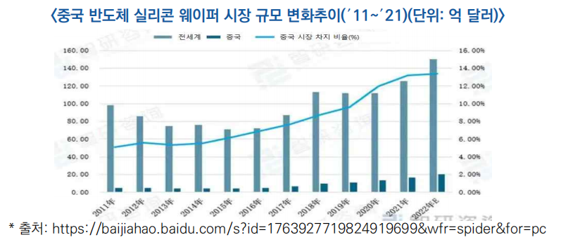 ○ 2021년 기준 중국의 반도체 실리콘 웨이퍼 시장 규모는 16.56억 달러 (2조 1,147억 원)로 전 세계 시장의 13.2%를 차지하고 이는 2011년 대비 8% p 상승 (국제반도체산업협회(SEMI) 통계자료)