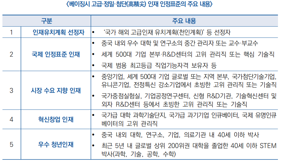 1) ‘외국인 고급·정밀·첨단(高精尖) 인재 인정표준(시행)’은 인재유치계획에 선정된 인재, 국제 인정표준 인재, 시장 수요 지향성 인재, 혁신창업 인재, 우수 청년인재 등 5개 유형