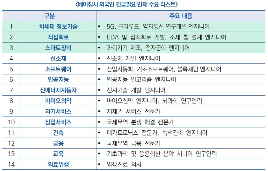 ![]() 2) ‘외국인 긴급필요 인재 수요 리스트(시행)’를 통해 차세대 정보기술, 집적회로, 스마트장비 등 14대 중점산업 분야 인재 수요 발표