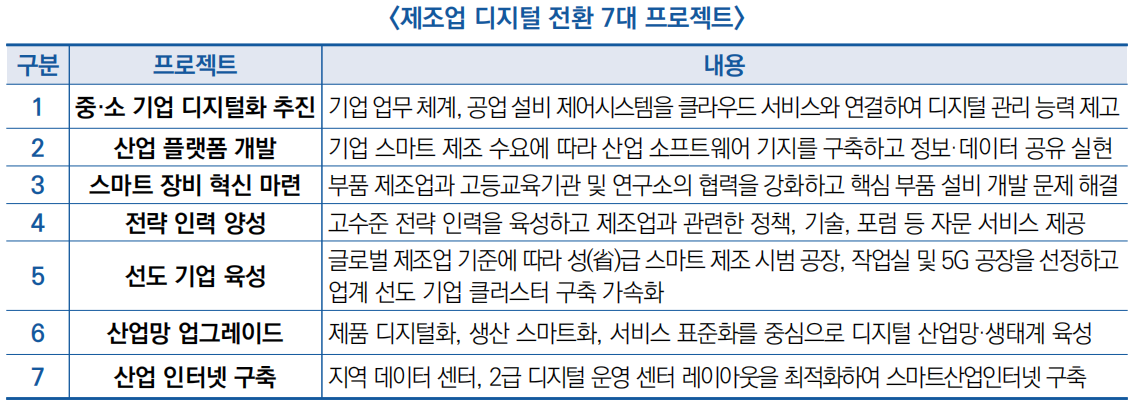 - ′25년까지 300개 이상의 '디지털 이전' 프로젝트 지원, 1~2개 등대공장(燈塔工廠), 100개 스마트 제조 시범 공장, 300개 성(省)급 스마트 제조 작업실 신설