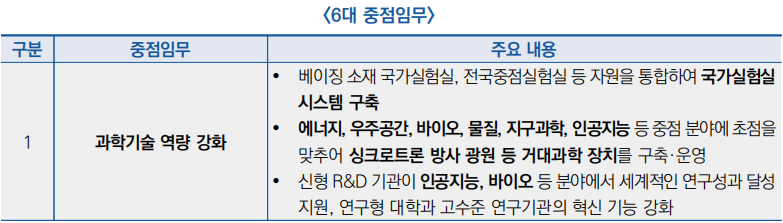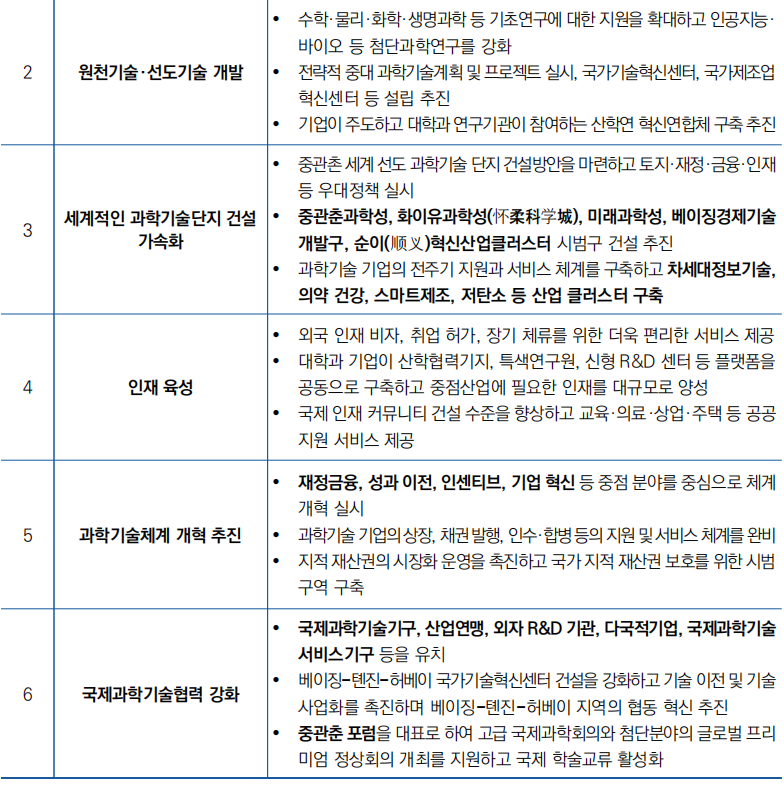 ○ 주요 내용으로 과학기술 역량 강화, 원천기술·선도기술 개발, 세계적인 과학기술단지 건설 가속화, 인재 육성, 과학기술체계 개혁 추진, 국제과학기술협력 강화 등 6대 중점임무 제시