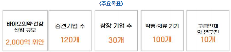 - 세포·유전자 치료, 첨단 의료 기기 스마트제조 등 분야에서 성과를 창출하고 약품·의료 기기 제품 100개 이상 출시 및 과학자, 글로벌 인재와 연구진 10명 이상 유치
