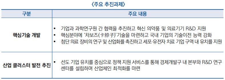 - ′25년까지 바이오의약·건강산업 규모 2,000억 위안(37조 7,420억 원)에 달성 및 중견기업 20개사, 상장 기업 30개사 배출