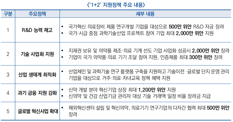 ![]() ○ 기업 성장을 지원하기 위한 생물의학, 건강산업 관련 ‘1+2’ 지원정책* 발표