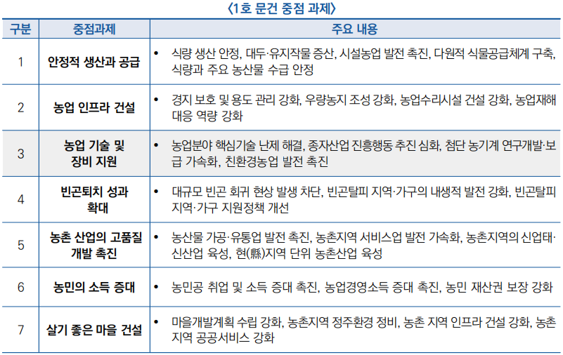 - 중점과제로 △안정적 생산·공급 △농업 인프라 건설 강화 △농업 기술·장비 지원 강화 △빈곤퇴치 성과 확대 등 9개 선정