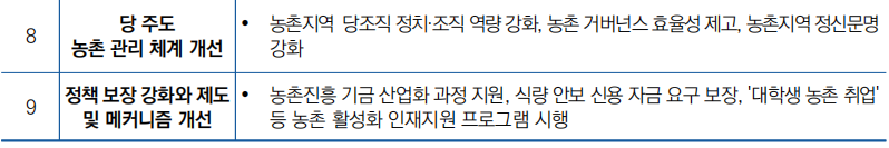 - 기존과 동일하게 ‘농촌 진흥’을 중점 사업으로 선정하고 식량 및 중요 농산물의 안정적 생산· 공급 보장을 강조