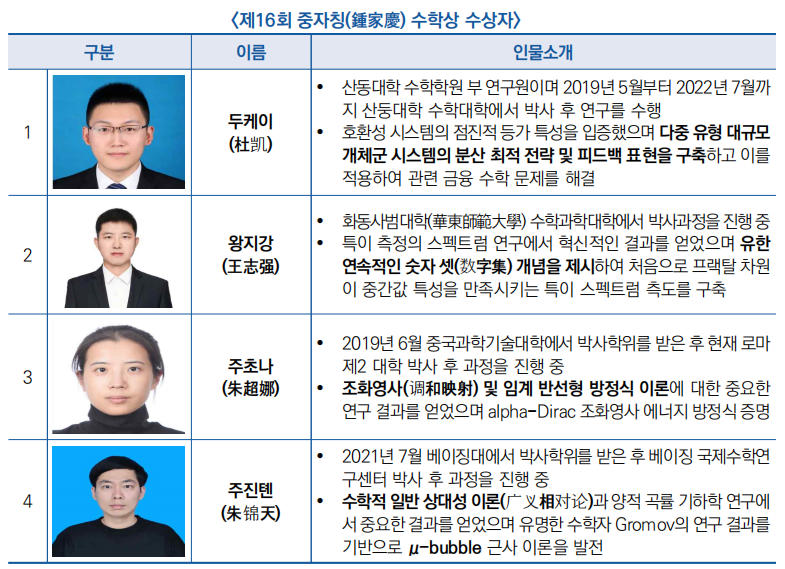 | 2022년 중국 수학계 ‘3대 상’ 수상자 선정 | ||