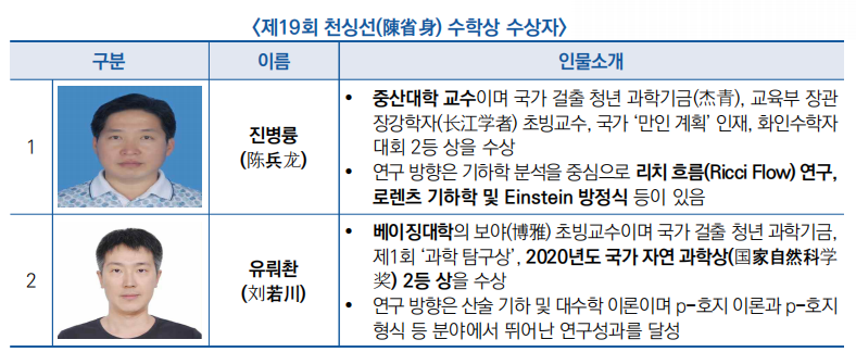 ○ 지난 2월 19일 개최된 ‘22년 중국수학회(中国数学会) 연례회의에서 제16회 화뤄겅(華羅庚) 수학상, 제19회 천싱선(陳省身) 수학상, 제16회 중자칭(鍾家慶) 수학상 수상자를 발표