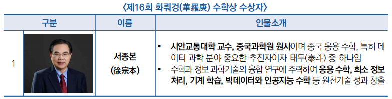 - (대상) 50세 이상인 수학분야 중요한 성과를 취득한 자