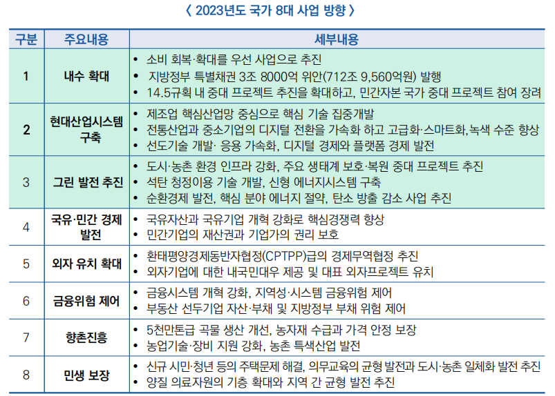 - 소비 회복 및 확대를 우선 사업으로 추진하고, 제조업 핵심 산업망의 핵심기술을 집중적으로 개발하며, 디지털경제·플랫폼경제 발전을 강조