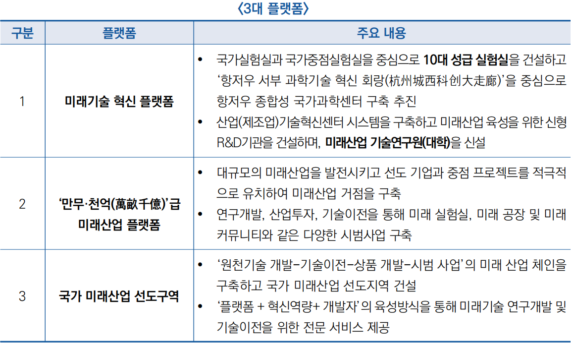 ![]() ![]() ○ 주요 내용으로 미래기술 혁신 플랫폼, ‘만무·천억(萬畝千億)’*급 미래산업 플랫폼, 국가 미래산업 선도구역(國家未來產業先導區) 등 3대 플랫폼 구축 제시