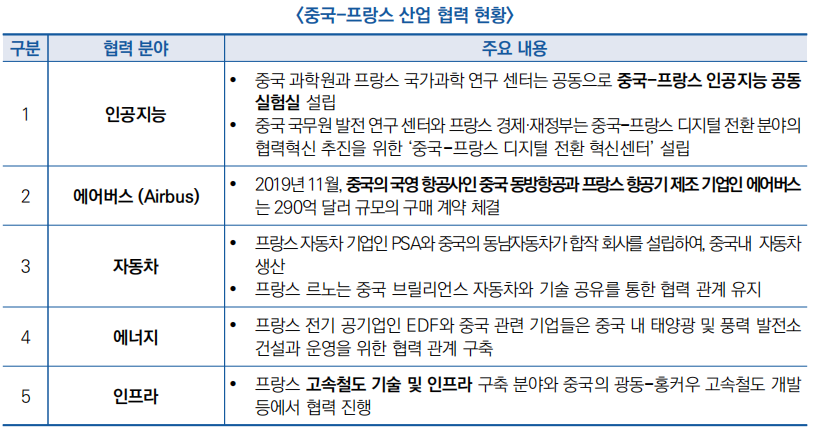 ○ 중국과 프랑스는 인공지능, 항공기, 자동차, 에너지 등 다양한 산업 분야에서 협력을 이루고 있음