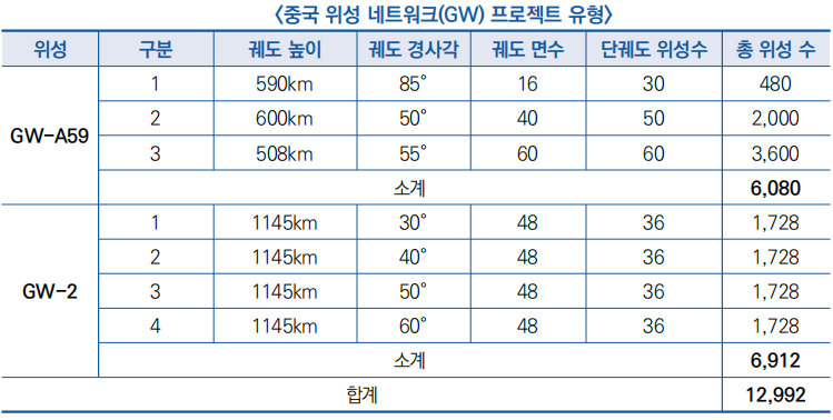 ○ 중국은 ′20년 국가 ‘신 인프라’ 정책에 위성인터넷 정보 인프라를 최초 포함시켰으며, ITU 자료에 따르면, 코드명 ’GW’로 2개의 저궤도 위성군, 총 12,992개의 위성 계획을 선언(′20.9.)