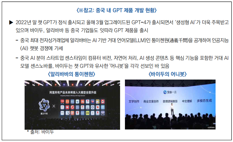□ 새로운 생성형 인공지능(AI)* 서비스는 서비스 출시 전 사전 정부 안전 평가 필요(4.12)