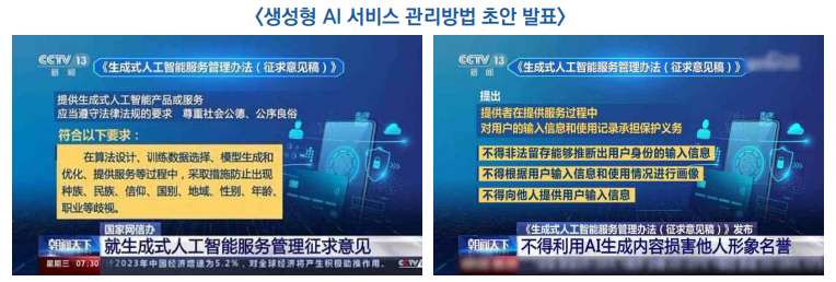 - 건전한 발전과 표준화된 적용을 촉진하기 위해 국가인터넷정보판공실은 ‘생성형 인공지능(AI) 서비스 관리방법(生成式人工智能服務管理辦法)’ 초안* 마련