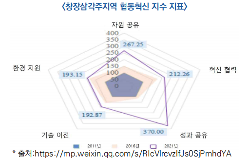 ○ 창장 삼각주 지역 협동 혁신지수는 ′11년 100점에서 ’21년 247.11점으로 상승하였고, 연평균 성장률 9.47% 기록