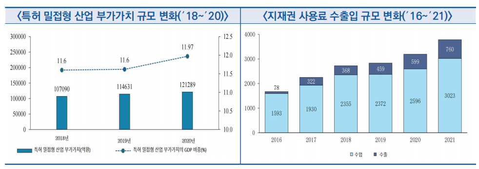 - ′20년에 중국 특허 밀접형 산업 부가가치의 GDP 대비 비중은 11.97%를 기록하고 ′18년부터 부가가치 규모 변화 상승 추세 유지