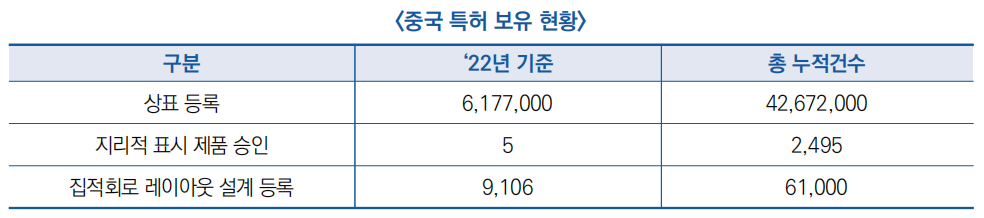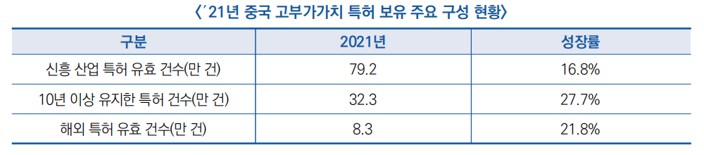 - ′22년에 중국 특허 보유기업은 35만 5,000개로 전년 대비 5만 7,000개 증가, 유효 특허 보유량은 232만4,000개로 전년 동기 대비 21.8% 증가