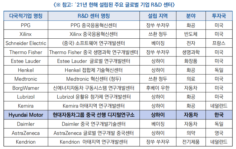- 그동안 외자 R&D 센터는 중국의 국제 첨단 기술 및 고급 인재 도입, 산업 기술 및 기술 혁신 능력 향상에 긍정적으로 기여