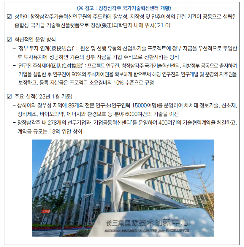 ○ 창장삼각주 국가기술혁신센터(이하 창장센터)는 선행기술 개발을 위해 ′22년말 기준 총 57건의 중대 산업기술혁신 프로젝트를 유치